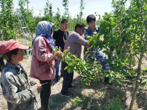 王躍(右一)指導村集體經濟果園工人稀果