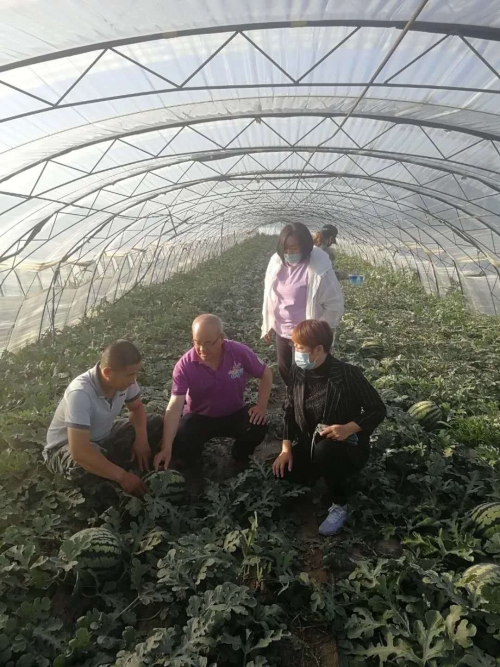 原秀樓(前中)指導村民大棚西瓜管理