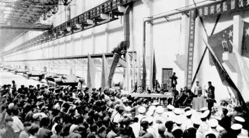 1959年是中華人民共和國(guó)建國(guó)十周年,工廠接受了生產(chǎn)32輛坦克交部隊(duì)編隊(duì)參加檢閱的任務(wù)。強(qiáng)烈的榮譽(yù)感使全廠上下歡欣鼓舞、斗志旺盛?!皼Q心書”、“保證書”像紛揚(yáng)的雪花貼滿墻壁?!疤齑蟮睦щy也要戰(zhàn)勝,堅(jiān)決為國(guó)爭(zhēng)光,為廠爭(zhēng)譽(yù)”的豪情在人們心中激蕩。