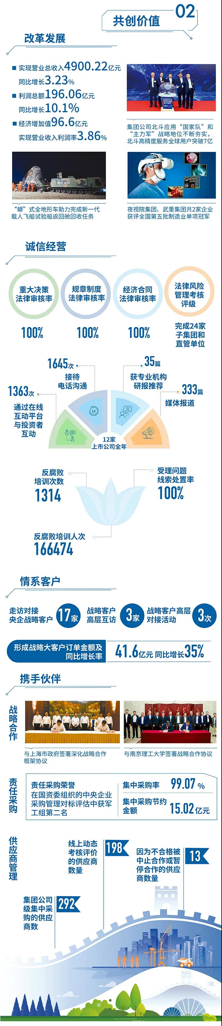 近日,國務(wù)院國資委在京舉辦“責(zé)任創(chuàng)造價值,責(zé)任引領(lǐng)未來——中央企業(yè)社會責(zé)任報告集中發(fā)布活動(2021)”,來自中央企業(yè)的92份《報告》向公眾全面展示央企認(rèn)真履行社會責(zé)任的成果。兵器工業(yè)集團(tuán)參加集中發(fā)布活動,并向社會公眾正式發(fā)布第十二份年度社會責(zé)任報告——《中國兵器工業(yè)集團(tuán)有限公司2020年社會責(zé)任報告》,全面披露2020年度集團(tuán)公司履責(zé)實(shí)踐和履責(zé)成效。會上發(fā)布了《中央企業(yè)社會責(zé)任藍(lán)皮書(2021)》,《中國兵器工業(yè)集團(tuán)有限公司:內(nèi)化于心外化于行,打造央企責(zé)任管理表率》成功入選典型案例。 2020年,是“十三五”規(guī)劃收官之年,也是全面建成小康社會、實(shí)現(xiàn)第一個百年目標(biāo)的決勝之年。集團(tuán)公司黨組書記、董事長焦開河在報告開篇指出,集團(tuán)公司實(shí)現(xiàn)了“十三五”圓滿收官,整體步入了高質(zhì)量發(fā)展軌道,呈現(xiàn)出基礎(chǔ)更牢、動力更強(qiáng)、空間更大、效能更高的積極向上良好態(tài)勢。在“十三五”特別是近三年來的工作實(shí)踐中,我們明確了“集團(tuán)公司是國家安全和國防建設(shè)的脊梁、是國家戰(zhàn)略科技力量最為重要的組成部分、是黨和國家最可信賴的‘六個力量’,肩負(fù)著支撐國防軍隊建設(shè)、推動科技自立自強(qiáng)、服務(wù)構(gòu)建新發(fā)展格局的重大政治責(zé)任和光榮使命,具有極強(qiáng)的政治屬性,性質(zhì)特殊、使命特殊、責(zé)任特殊”的新時代新階段職責(zé)使命,深化了對“堅持以習(xí)近平新時代中國特色社會主義思想定向領(lǐng)航,是集團(tuán)公司高質(zhì)量發(fā)展的根本遵循;保持貫徹落實(shí)習(xí)近平總書記重要指示批示和黨中央決策部署的戰(zhàn)略定力,是集團(tuán)公司高質(zhì)量發(fā)展的根本前提;履行好強(qiáng)軍這個首要職責(zé),是集團(tuán)公司高質(zhì)量發(fā)展的根本要求;加快兵器科技創(chuàng)新突破,是集團(tuán)公司高質(zhì)量發(fā)展的根本支撐;加強(qiáng)黨的領(lǐng)導(dǎo)黨的建設(shè),是集團(tuán)公司高質(zhì)量發(fā)展的根本保證”的兵器工業(yè)改革發(fā)展規(guī)律認(rèn)識。 《報告》聚焦“抗疫斗爭中的‘兵器力量’”,生動展示了集團(tuán)公司抗擊疫情的有力行動,展現(xiàn)了集中力量辦大事、急國家之所急的“兵器速度”,彰顯了“把一切獻(xiàn)給黨”的人民兵工精神和貫徹落實(shí)國家決策部署的責(zé)任擔(dān)當(dāng)。《報告》以“用心守候和平、用情溫暖社會”為主題,從恪守本責(zé)、共創(chuàng)價值、致力和諧、踐行綠色、責(zé)任管理五個維度,全面展現(xiàn)集團(tuán)公司在堅持履行政治責(zé)任、經(jīng)濟(jì)責(zé)任、社會責(zé)任,履行強(qiáng)軍首責(zé)、加強(qiáng)黨的建設(shè)、打造國家戰(zhàn)略科技力量、推進(jìn)“一帶一路”倡議、打好打贏三大攻堅戰(zhàn)、深化改革、助力員工成長、支持社會公益事業(yè)、提升社會責(zé)任管理等方面的生動實(shí)踐和履責(zé)亮點(diǎn),凸顯集團(tuán)公司保持貫徹落實(shí)黨中央決策部署的戰(zhàn)略定力、在聚焦主責(zé)主業(yè)、科技引領(lǐng)、國際化經(jīng)營上持續(xù)用力,為實(shí)現(xiàn)第一個百年奮斗目標(biāo)貢獻(xiàn)力量的初心與行動?!秷蟾妗吩俅潍@得中國企業(yè)社會責(zé)任報告評級專家委員會“五星佳”最高評級,兵器工業(yè)集團(tuán)成為軍工行業(yè)唯一連續(xù)10年獲得最高評級的企業(yè)。 2021年是開啟新征程的開局之年,也是建黨100周年、人民兵工創(chuàng)建90周年,兵器工業(yè)集團(tuán)將全面貫徹落實(shí)黨中央戰(zhàn)略部署,緊扣推動高質(zhì)量發(fā)展主題,圍繞“十四五”開好局、起好步,堅決完成黨中央賦予的職責(zé)使命,履行好中央企業(yè)和軍工集團(tuán)的政治責(zé)任、經(jīng)濟(jì)責(zé)任、社會責(zé)任,為實(shí)現(xiàn)中國夢強(qiáng)軍夢作出新的更大貢獻(xiàn)! 一圖看懂《中國兵器工業(yè)集團(tuán)有限公司2020年社會責(zé)任報告》 |
