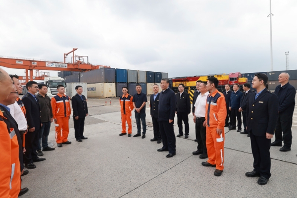 4月22日至24日,中共中央總書記、國家主席、中央軍委主席習(xí)近平在重慶考察。這是22日下午,習(xí)近平在重慶國際物流樞紐園區(qū)重慶鐵路集裝箱中心站,同貨車司機(jī)、列車司機(jī)、裝卸工人、場(chǎng)站管理人員等親切交流。