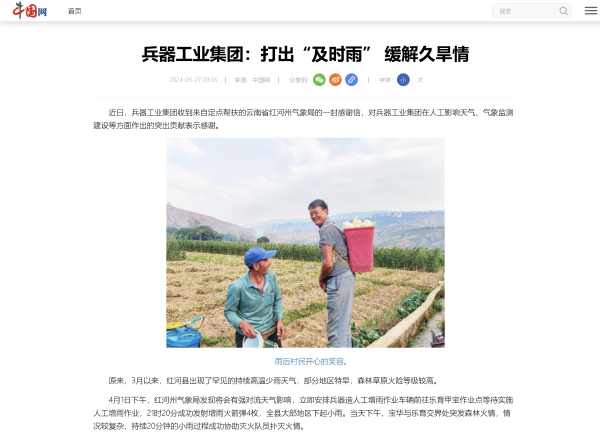 5月27日,中國(guó)網(wǎng)刊發(fā)《兵器工業(yè)集團(tuán):打出“及時(shí)雨” 緩解久旱情》,對(duì)中國(guó)兵器工業(yè)集團(tuán)有限公司助力云南省紅河州人工影響天氣、氣象監(jiān)測(cè)建設(shè)等方面作出的突出貢獻(xiàn)作了報(bào)道。 兵器工業(yè)集團(tuán):打出“及時(shí)雨” 緩解久旱情 近日,兵器工業(yè)集團(tuán)收到來(lái)自定點(diǎn)幫扶的云南省紅河州氣象局的一封感謝信,對(duì)兵器工業(yè)集團(tuán)在人工影響天氣、氣象監(jiān)測(cè)建設(shè)等方面作出的突出貢獻(xiàn)表示感謝。 原來(lái),3月以來(lái),紅河縣出現(xiàn)了罕見(jiàn)的持續(xù)高溫少雨天氣,部分地區(qū)特旱,森林草原火險(xiǎn)等級(jí)較高。 4月1日下午,紅河州氣象局發(fā)現(xiàn)將會(huì)有強(qiáng)對(duì)流天氣影響,立即安排兵器造人工增雨作業(yè)車(chē)輛前往樂(lè)育甲寶作業(yè)點(diǎn)等待實(shí)施人工增雨作業(yè),21時(shí)20分成功發(fā)射增雨火箭彈4枚,全縣大部地區(qū)下起小雨。當(dāng)天下午,寶華與樂(lè)育交界處突發(fā)森林火情,情況較復(fù)雜,持續(xù)20分鐘的小雨過(guò)程成功協(xié)助滅火隊(duì)員撲滅火情。