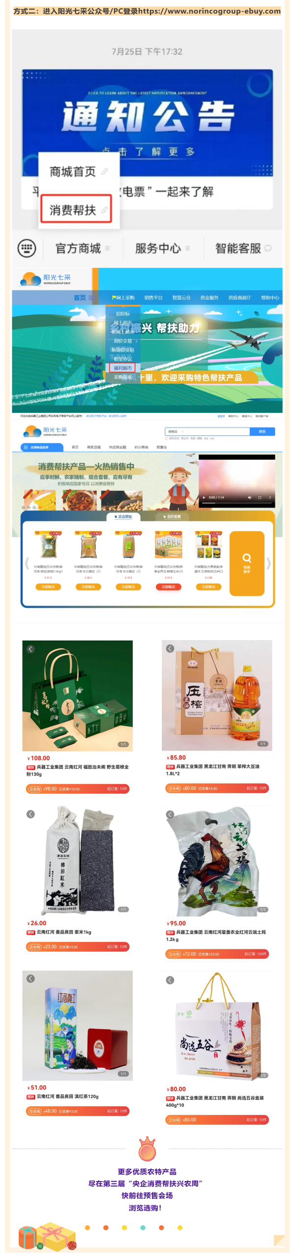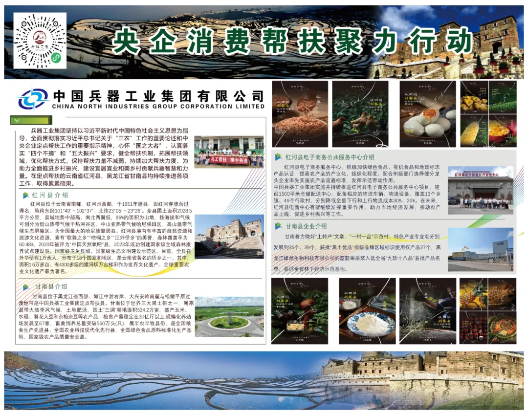 百家央企聚合力 消費(fèi)幫扶促振興 第三屆“央企消費(fèi)幫扶興農(nóng)周” 預(yù)售已啟動 8月30日 興農(nóng)周活動將正式開啟 “央企消費(fèi)幫扶興農(nóng)周”由國務(wù)院國資委社會責(zé)任局指導(dǎo),央企消費(fèi)幫扶電商平臺(國網(wǎng)數(shù)字科技控股有限公司)主辦,國務(wù)院國資委機(jī)關(guān)服務(wù)管理局、國務(wù)院國資委新聞中心、國網(wǎng)北京市電力公司、各中央企業(yè)電商平臺聯(lián)合協(xié)辦。 活動以“央企攜手,興農(nóng)惠民”為主題,組織動員中央企業(yè)所屬各單位各部門(特別是工會、食堂)、廣大干部職工、上下游供應(yīng)商和業(yè)務(wù)合作伙伴采購幫扶縣的優(yōu)質(zhì)農(nóng)產(chǎn)品,促進(jìn)脫貧地區(qū)產(chǎn)業(yè)發(fā)展和脫貧群眾穩(wěn)定增收,鞏固拓展脫貧攻堅(jiān)成果。 預(yù)售活動火熱開啟 為方便大家提前選購 此次預(yù)售期升級為10天 (8月20日-8月29日) 誠邀下單 兵器工業(yè)集團(tuán)定點(diǎn)幫扶 黑龍江甘南縣、云南紅河縣 農(nóng)特產(chǎn)品! 8月30日-9月5日 請鎖定“央企館-兵器工業(yè)集團(tuán)” 我們一起共譜鄉(xiāng)村振興新篇章! |
